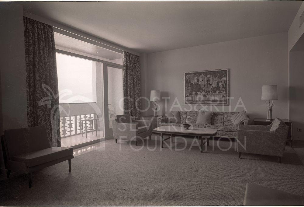 Black and white photograph of the Cyprus Hilton Hotel bedroom the day before its inauguration, possibly for advertisement purposes.