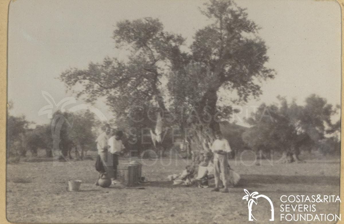 Black and white photograph of three men standing near a tree at Mesaoria with crates and jugs.